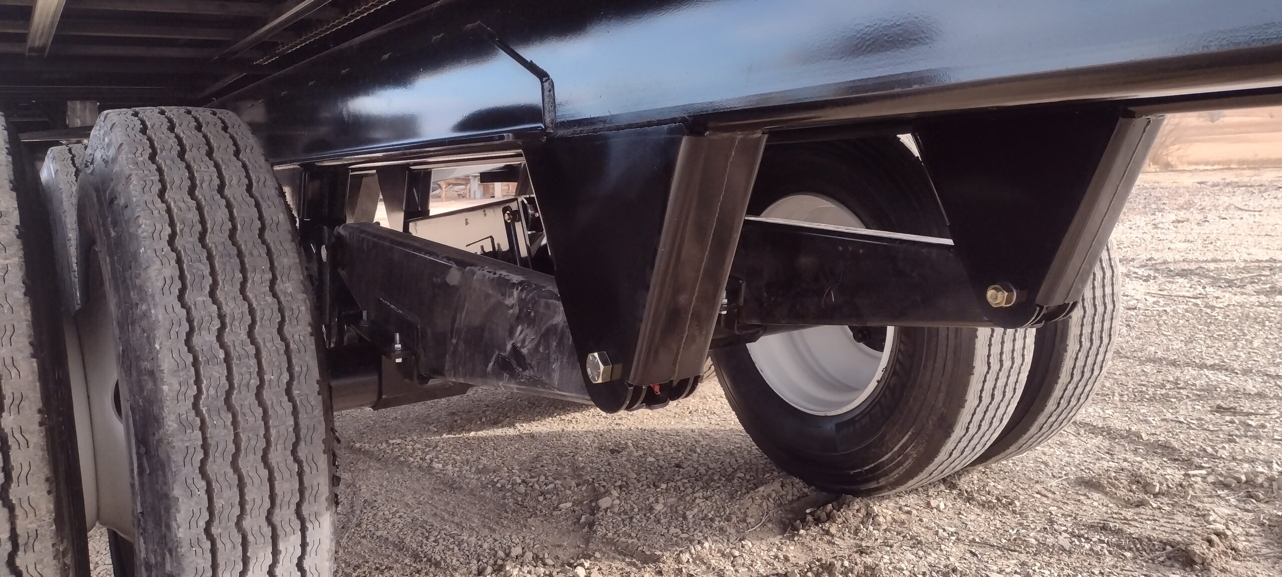 The option includes a second axle with duals (which makes eight 11R 22.5 tires total) and a rocker arm suspension system (shown in the picture) — it also includes beefed up floor supports and the 8 inch knife hood extension. This option allows you to stack the 3x4x8 bales turning the 6 bale trailer mount unit into a 12 bale trailer mount unit. (Click on the Twelve Bale Trailer Mounted unit pictured above for another view)